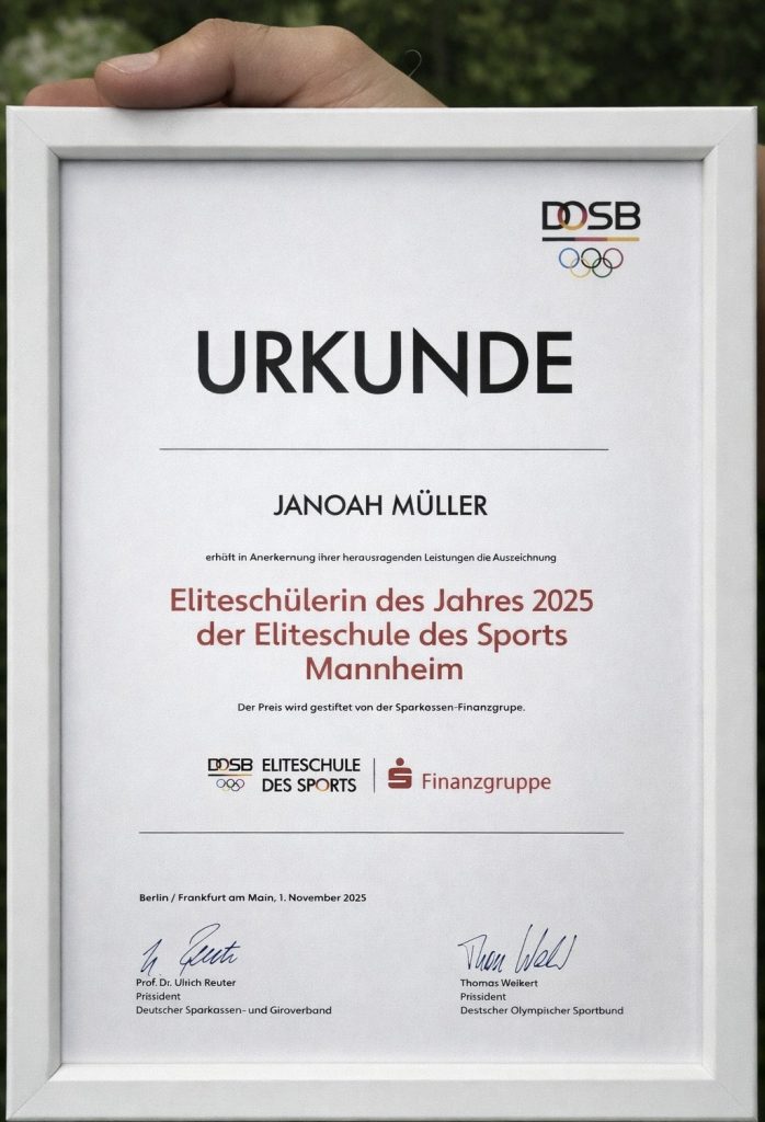 Den feierlichen Höhepunkt der Veranstaltung bildete die Ehrung selbst. Thomas Kowalki würdigte Janoah Müller im Namen der Sparkasse Rhein-Neckar Nord als Eliteschülerin des Jahres 2025 der Mannheimer Eliteschulen des Sports. In seiner Ansprache betonte er die besondere Bedeutung der schulischen Förderung im Leistungssport und die Verantwortung starker regionaler Partner. Mit der Auszeichnung ist ein Förderbetrag von 7.000 Euro verbunden, der dem Ludwig-Frank-Gymnasium zugutekommt. Das Preisgeld unterstützt unter anderem den umfangreichen organisatorischen Aufwand, Nachführunterricht sowie flexible schulische Strukturen, die es Spitzensportlerinnen ermöglichen, den Lernstoff auch außerhalb des regulären Unterrichts erfolgreich zu bewältigen.